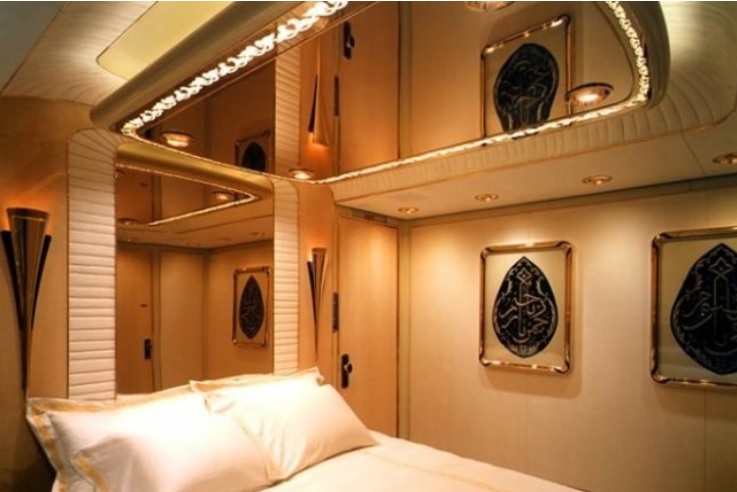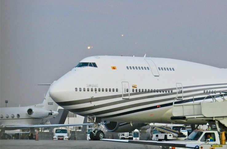 با توجه به اینکه ۷۴۷-۴۰۰، که یک نوع به روز شده از بوئینگ ۷۴۷ است، می تواند تا ۴۱۶ مسافر را جابجا کند، اینگونه به نظر می سد که سلطان یک کاخ برای پرواز دارد؛ و این تنها یکی از هواپیما های متعدد اوست. سلطان همچنین دارای یک بوئینگ ۷۶۷-۲۰۰، یک ایرباس A۳۴۰-۲۰۰ و حداقل دو هلیکوپتر سیکورسکی است. گفته می شود ۷۴۷-۴۰۰ مورد علاقه او برای زمانی است که به خارج از کشور پرواز می کند. او پرواز های بین المللی زیادی انجام می دهد و این کاخ متحرک برای مسافت های طولانی عالی است. یک ۷۴۷-۴۰۰ استاندارد بردی معادل ۱۳۴۵۰ کیلومتر (۷۲۶۲ مایل دریایی) دارد، اما هواپیمای سلطان دارای مخازن سوخت اضافی است، بنابراین می تواند به راحتی از ۱۵۰۰۰ کیلومتر (۸۱۰۰ کیلومتر) عبور کند. از آنجایی که این جت شخصی یک مقام دولتی است، جزئیات زیادی در مورد آن علنی نشد. اما آن هایی که منتشر شدند تصویر بسیار واضحی را نشان می دهند: جت راحتی و تجمل باورنکردنی را به سلطان و همراهان بزرگ ارائه می دهد. اتاقی که همه چیز دارد، از یک دفتر خصوصی کنترل از راه دور گرفته تا یک اتاق خواب اصلی با حمام اختصاصی، یک اتاق غذاخوری رسمی با ظروف سفارشی و لیوان هایی با پایه نقره ای قابل جابجایی، یک اتاق کنفرانس، و فضا های مختلف مانند سالن. حمام ها، توالت و دستشویی ها و دیگر وسایل این هواپیما از طلا و روکش طلا ساخته شده است.