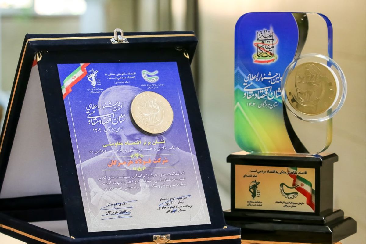 در انتهای این مراسم نشان ویژه اقتصاد مقاومتی به تولیدکنندگان و صنعتگران برتر بخش دولتی و خصوصی هرمزگان اهدا شد که در این راستا، شرکت فولاد هرمزگان نیز به دلیل سرمایهگذاری در مسیر کارآفرینی، تولید، اشتغال مولد بهبود فضای کسب و کار، بر اساس ارزیابیهای صورت پذیرفته به عنوان واحد برتر اولین جشنواره اعطای نشان اقتصاد مقاومتی در سال ۱۴۰۲ انتخاب شد و توانست لوح تقدیر و تندیس این مراسم را دریافت کند.
