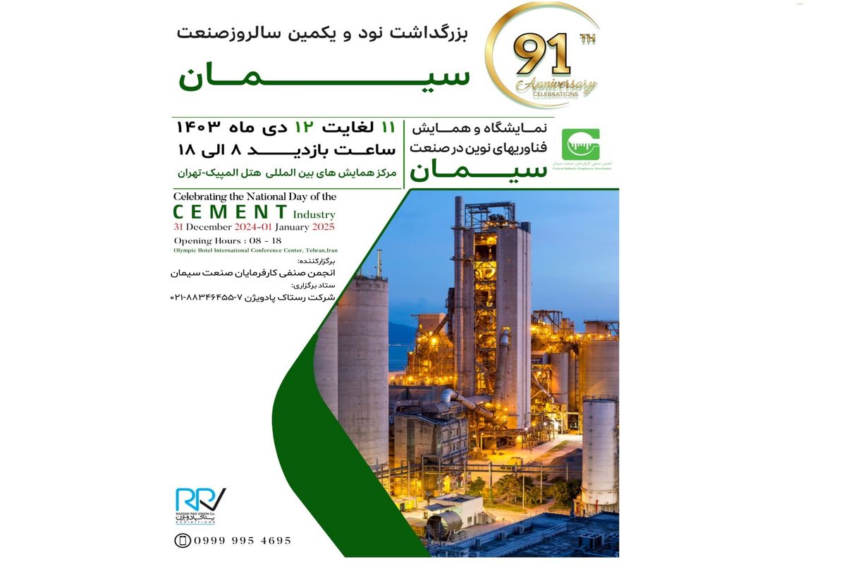 همایش و نمایشگاه تخصصی فن آوری های نوین صنعت سیمان ۱۴۰۳ در تاریخ ۱۱ و ۱۲ دی ماه و در مرکز همایش های بین المللی هتل المپیک تهران برگزار خواهد شد. این رویداد به مناسبت نود و یکمین جشن ملی سالروز تاسیس صنعت سیمان و به همت انجمن صنفی کارفرمایان صنعت سیمان با همکاری شرکت رستاک پاد ویژن برگزار خواهد شد.