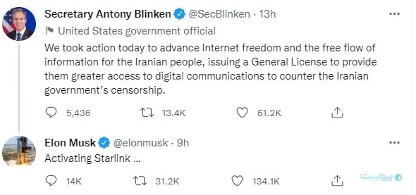ماسک در پاسخ به توییت بلیکن که به اقدام آمریکا برای توسعه اینترنت آزاد و جریان آزاد اطلاعات برای مردم ایران اشاره دارد گفت: «در حال فعال‌سازی استارلینک…»